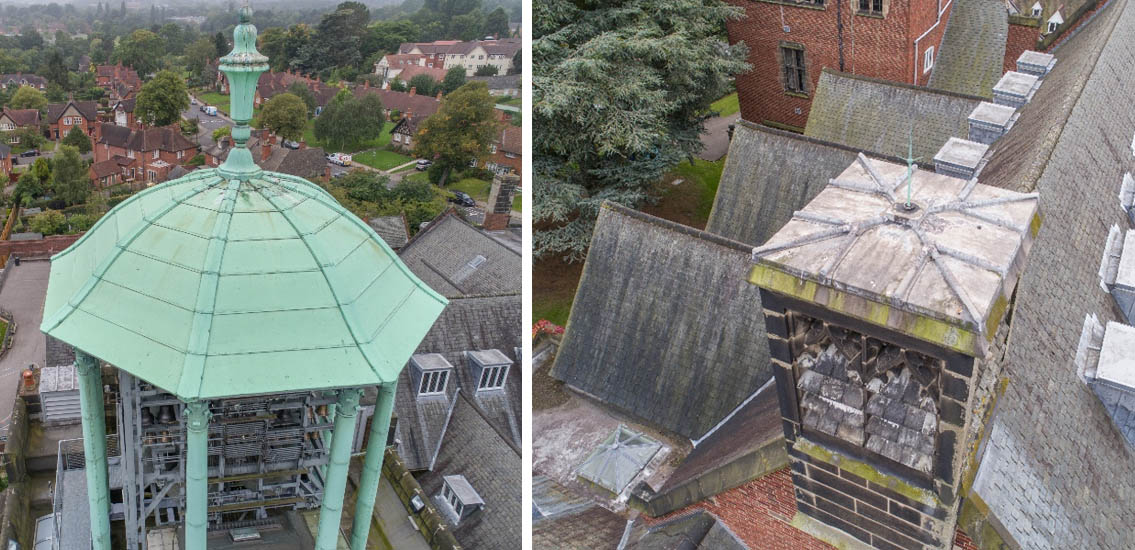Roof areas were inspected by drone which allowed an inspection to be made of the copper covered pergola roof of the Carillion tower, chimney stacks and concealed and inaccessible areas of lead roof including valley gutters and dormer roofs.